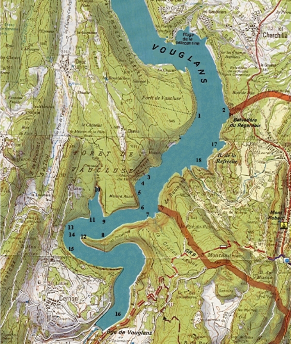 14: L'ancien barrage, > 55m 15: Le surplomb 16: Le Plan 10-20-40m 17: La Réfraiche 10-20-40m